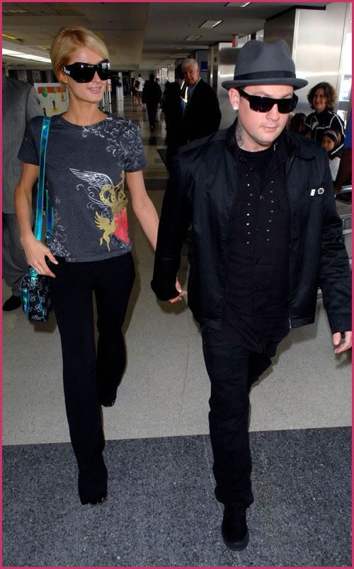 Paris Hilton and Benji Madden were spotted making their way through the terminal at LAX International Airport yesterday, holding hands and looking lovey-dovey.